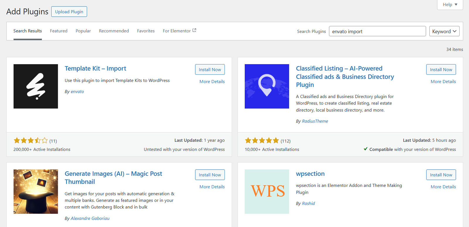 Search for Envato Import (The plugin will be called Template Kit – Import but searching this directly in the plugin tab doesn’t always work)